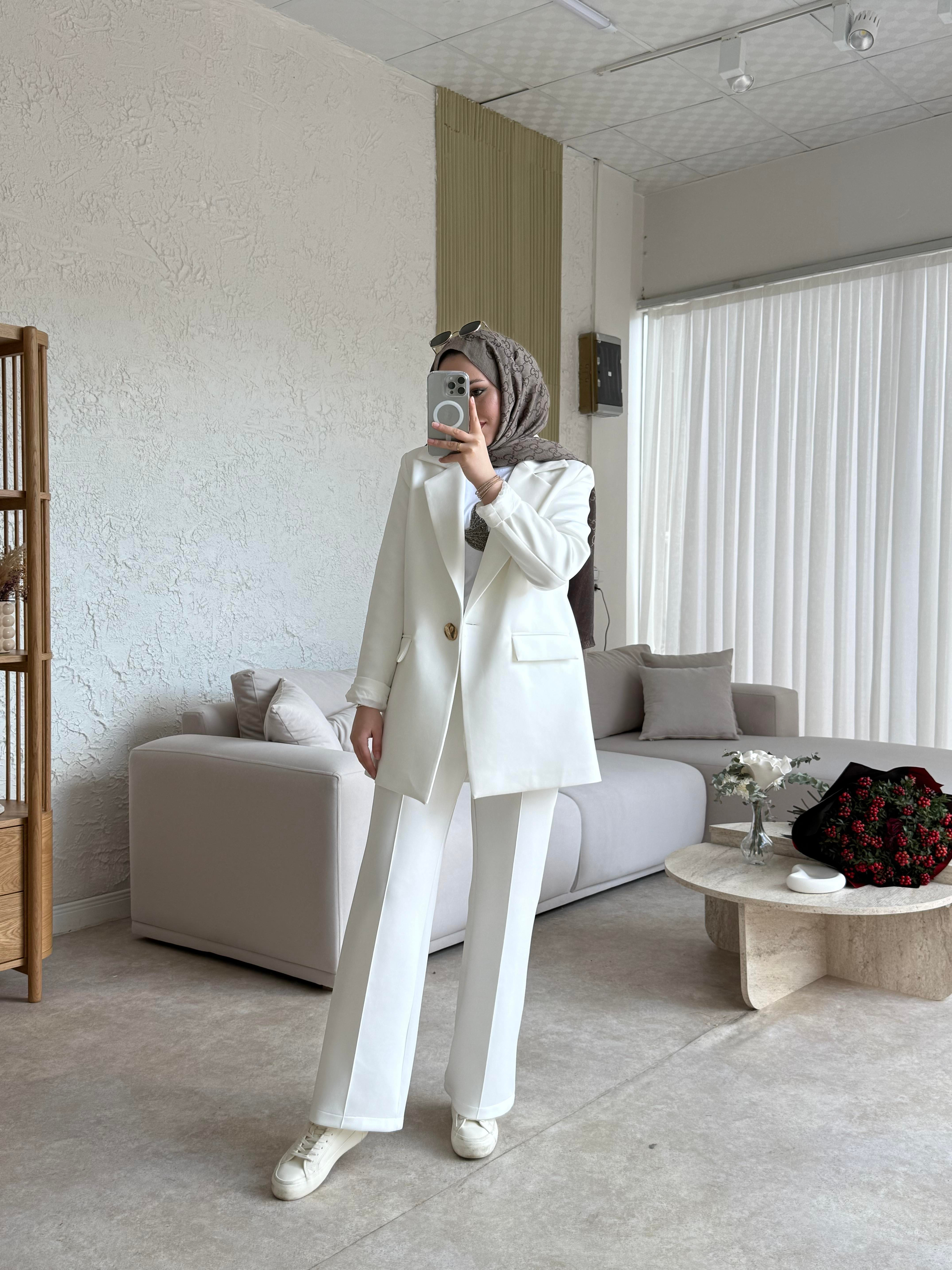 Blazer Ceketli Takım -beyaz - Vakronline modelleri Vakronline tesettür giyim koleksiyonunun en şık parçaları arasında yer alıyor. Modern tasarımı ve rahat kalıbı ile hem günlük yaşamda hem de özel günlerde tercih ediliyor. Vakronline kalitesiyle sunulan bu ürün, zarif detayları ve kumaş kalitesi ile kullanıcıların beğenisini kazanıyor. Yeni sezon trendlerini yansıtan bu parçalar ile stilinize tesettür modasında şıklık katabilirsiniz. Vakronline güvencesiyle hızlı kargo ve kolay iade imkânı da sizleri bekliyor.