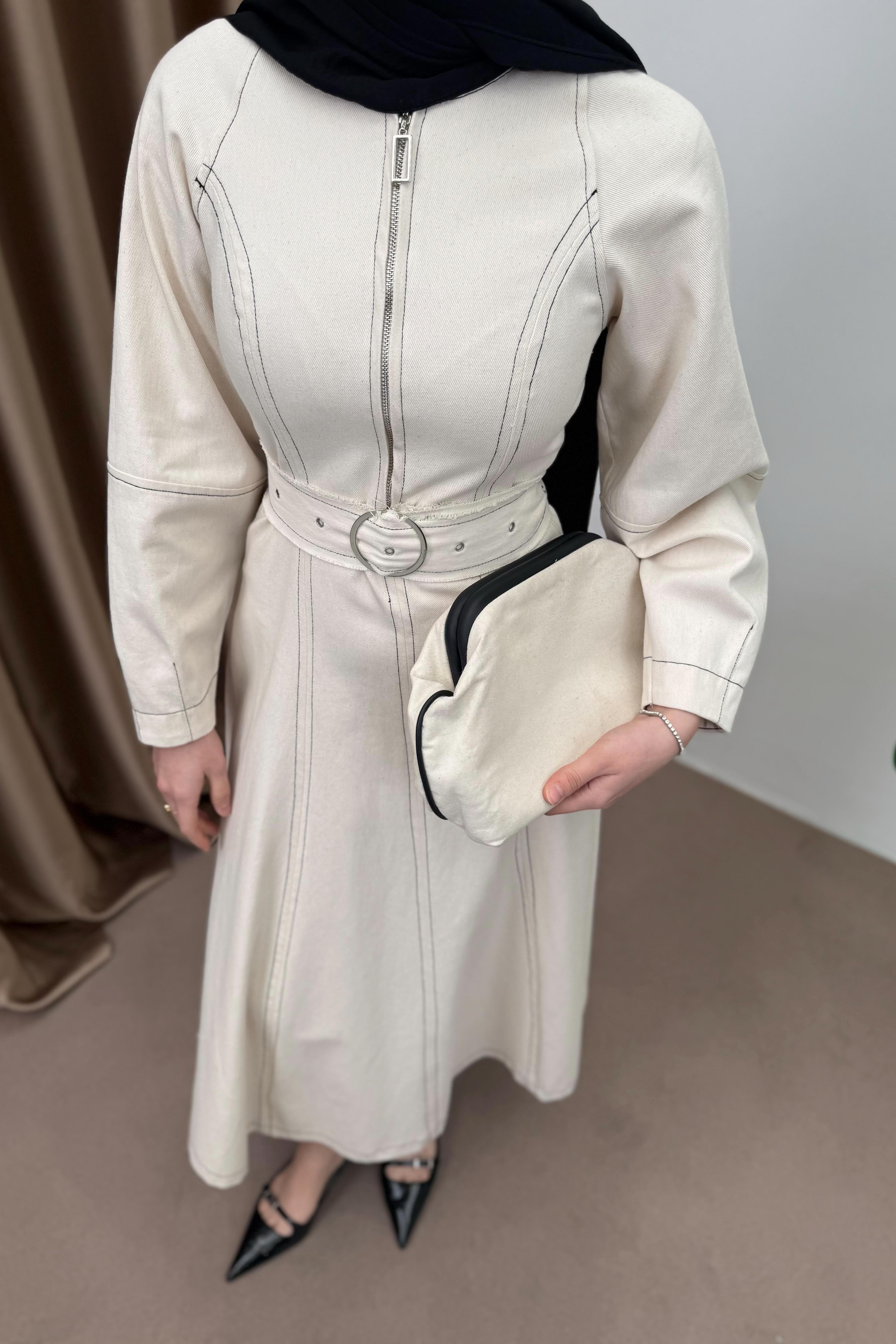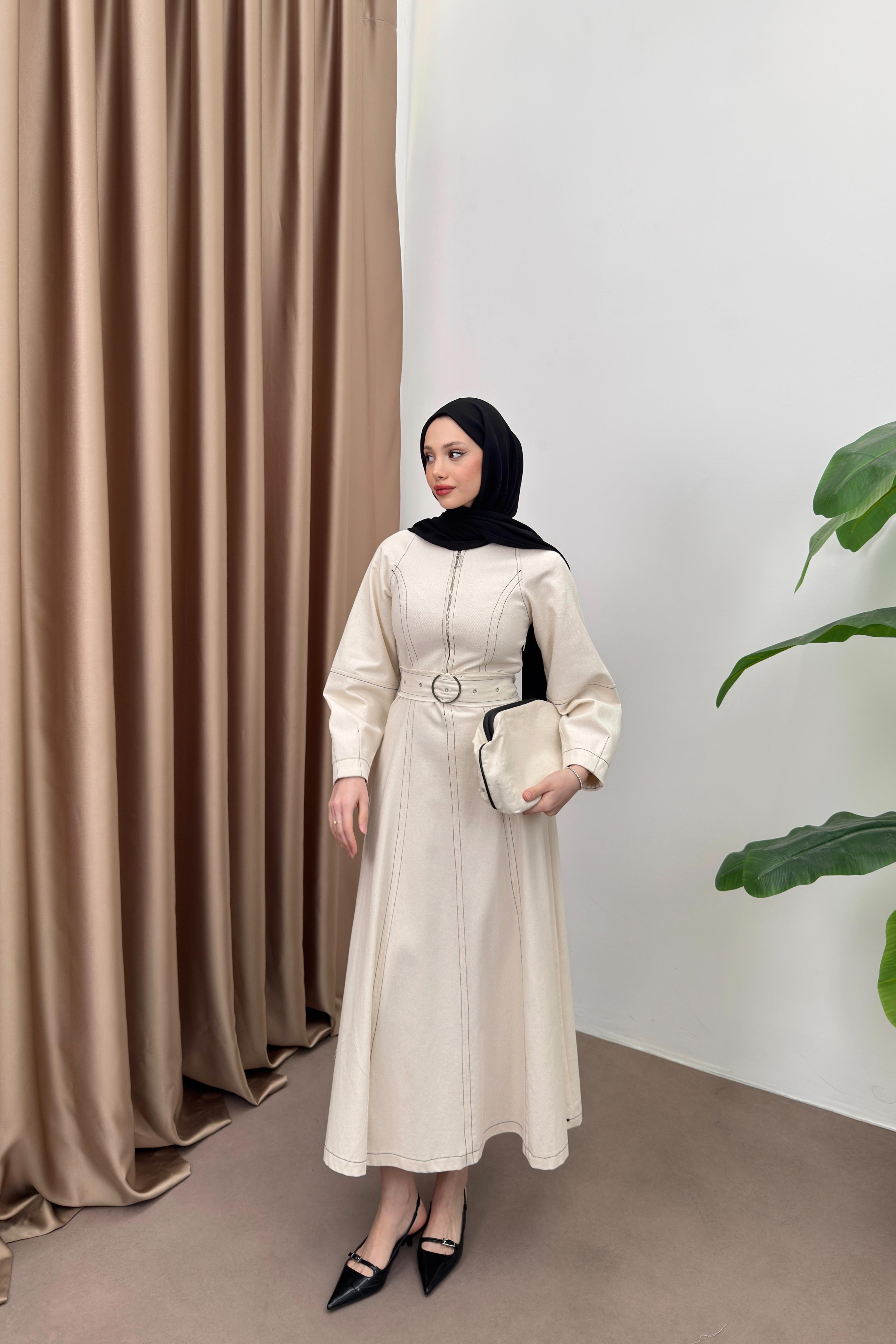 Bisiklet yaka, önden yarım fermuarlı, balon kollu, belden oturtmalı, seyyar kuşaklıdır.