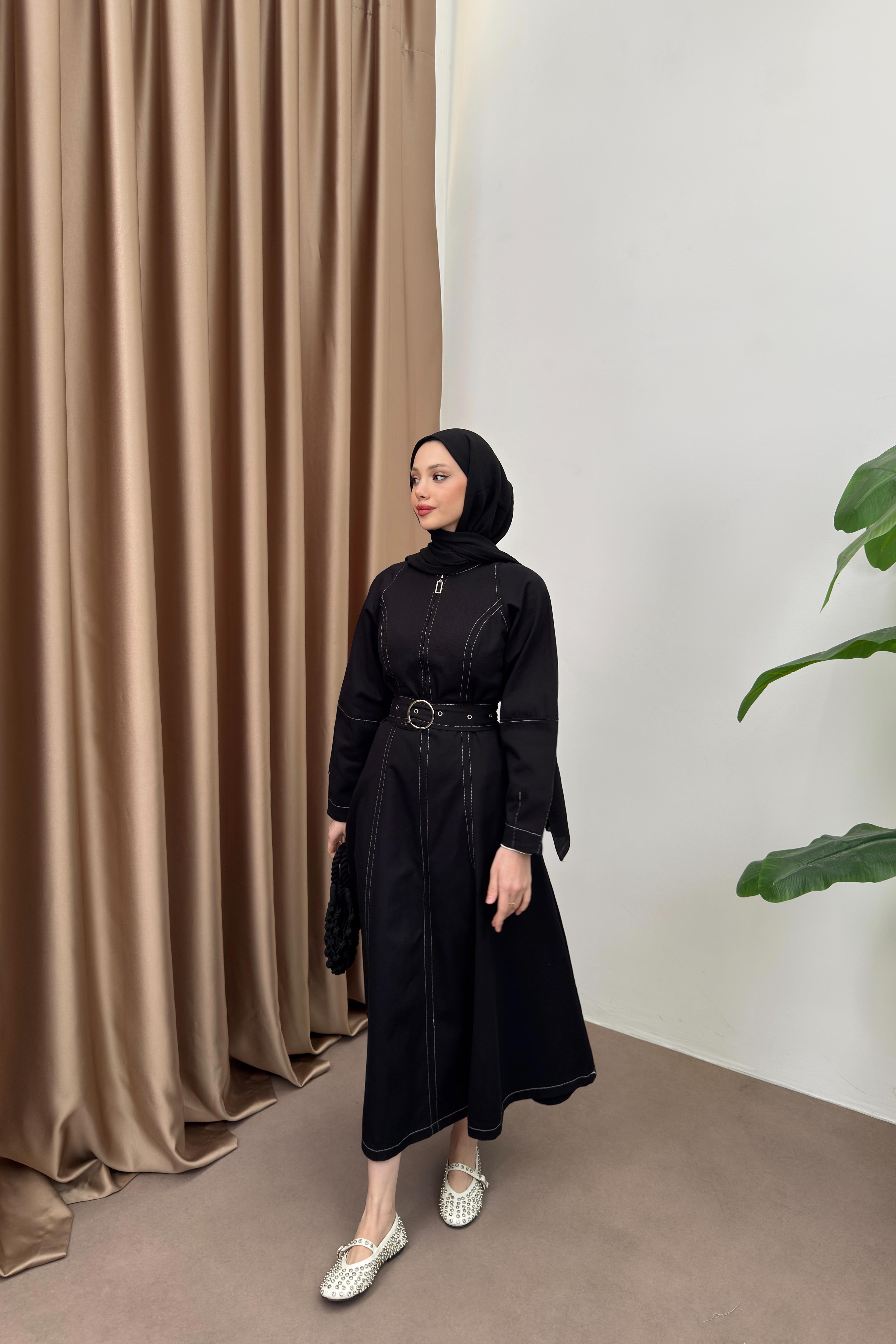 Bisiklet yaka, önden yarım fermuarlı, balon kollu, belden oturtmalı, seyyar kuşaklıdır.