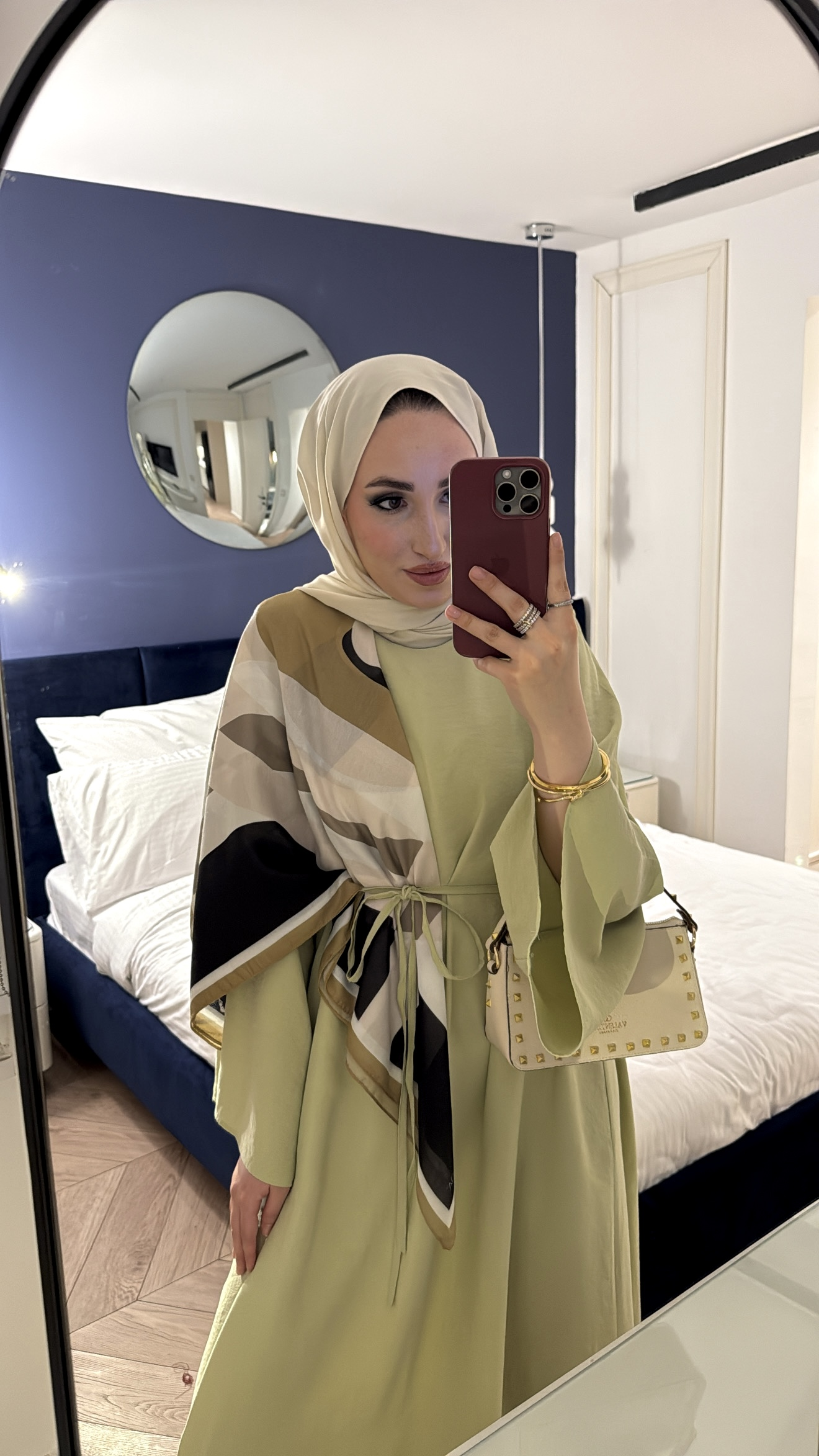 Yarım dik yaka, arkadan fermuarlı, geniş kollu, şal aksesuar ürüne dahildir. İp kemerli, düz kesim elbise.