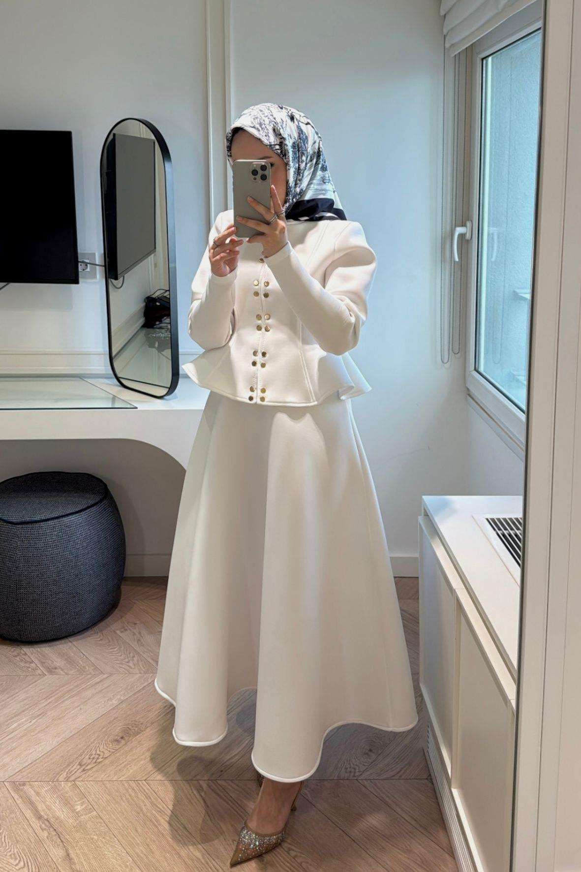 Esnek ve tok yapıya sahip scuba kumaştan üretilmiş, bel bölgesi vücuda oturan şekilde tasarlanmış şık bir takımdır. Hem toparlayıcı hem de formunu koruyan yapısıyla modern ve zarif bir görünüm sunar. Genellikle üst–alt kombin halinde hazırlanır ve hem günlük şıklıkta hem de özel davetlerde kullanılabilir.