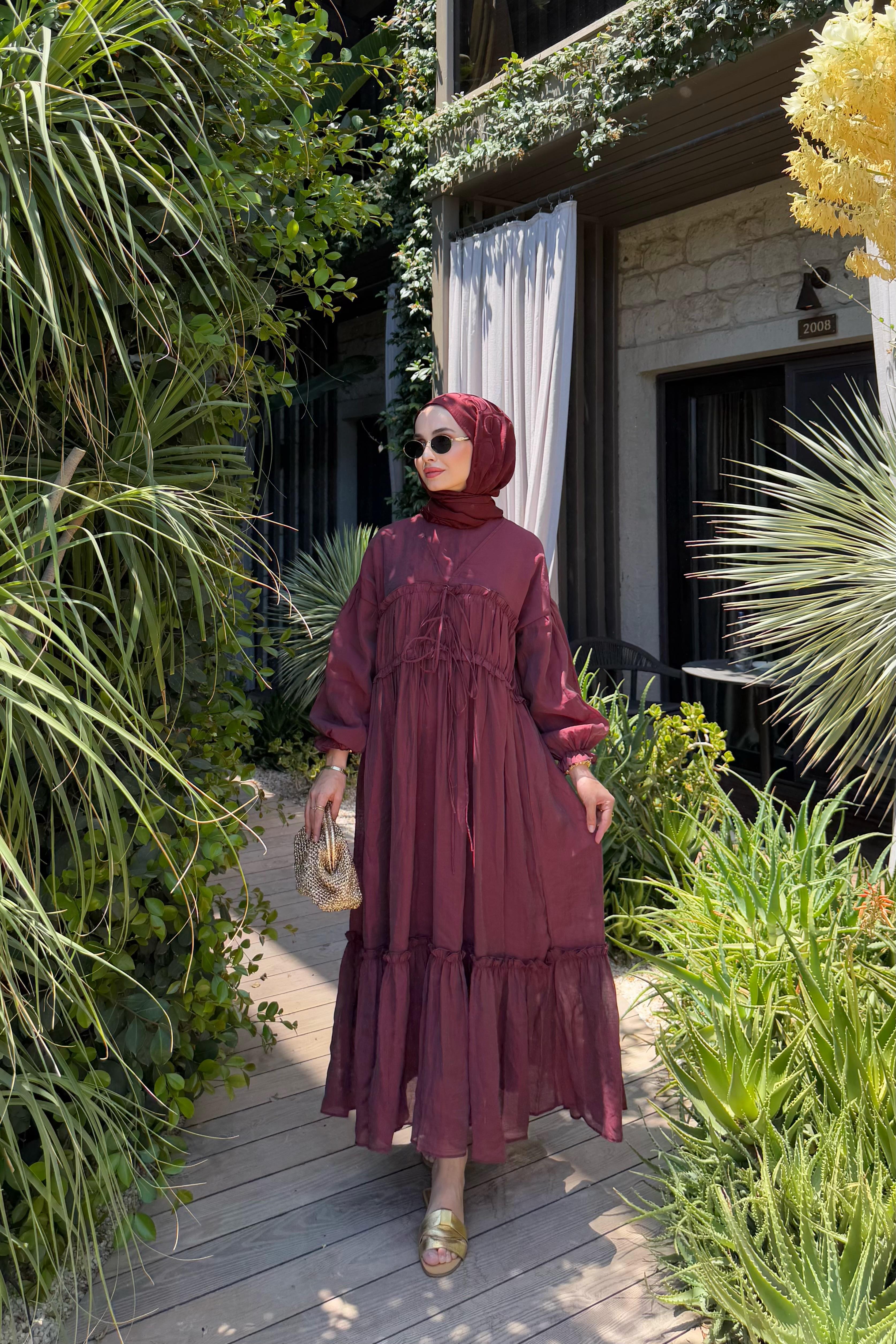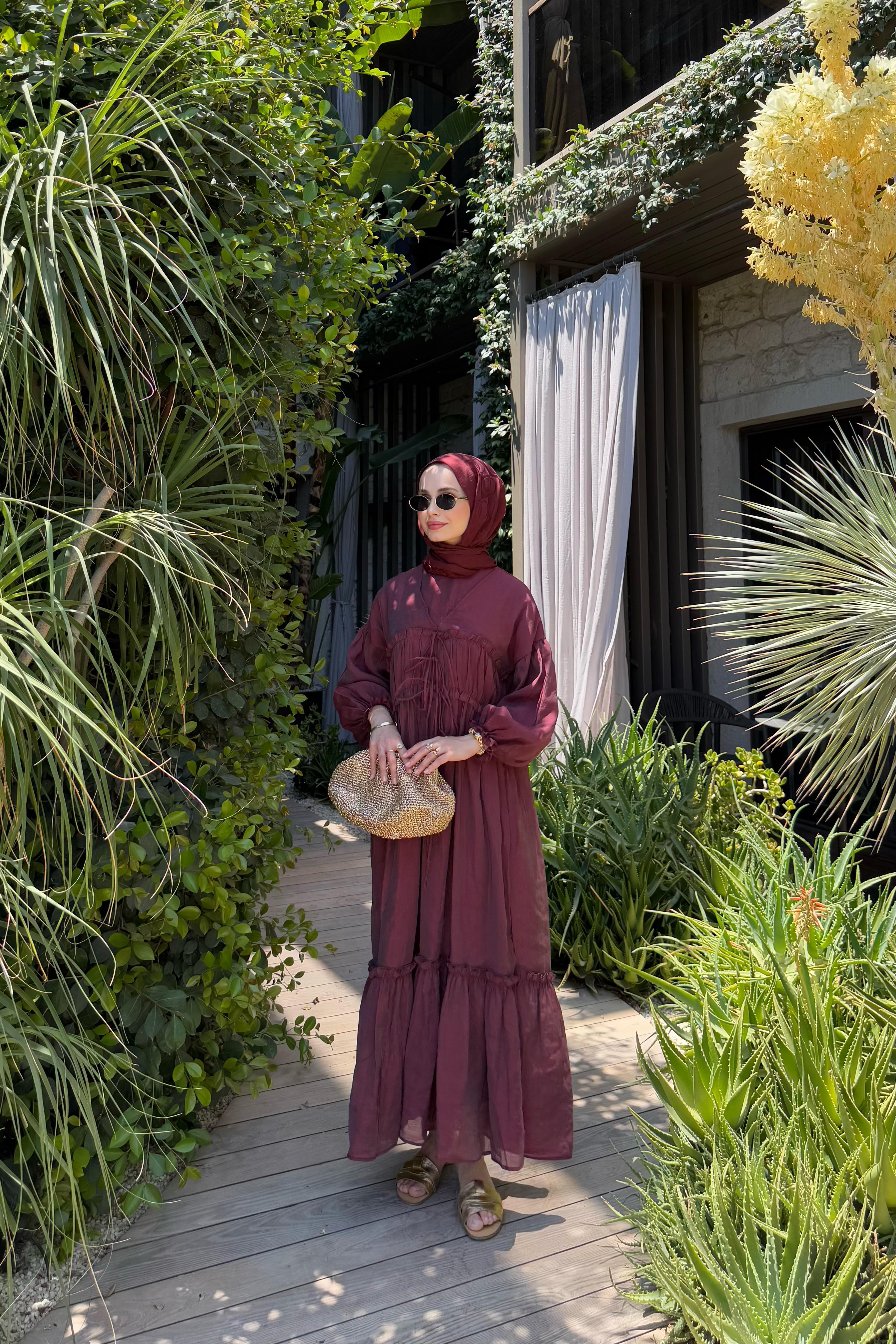 Tesettür Brice Özel Seri Bağlamalı Elbise-bordo