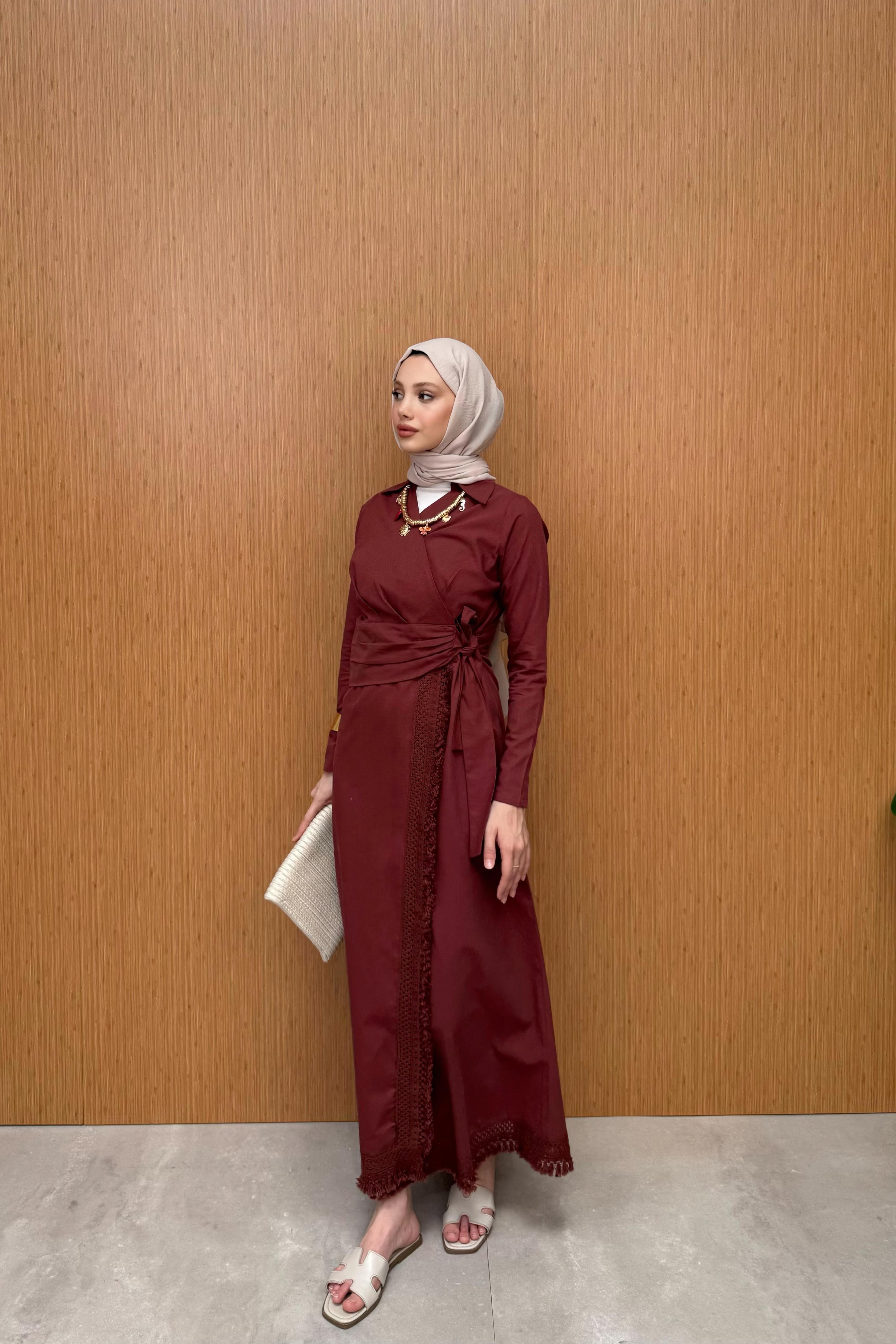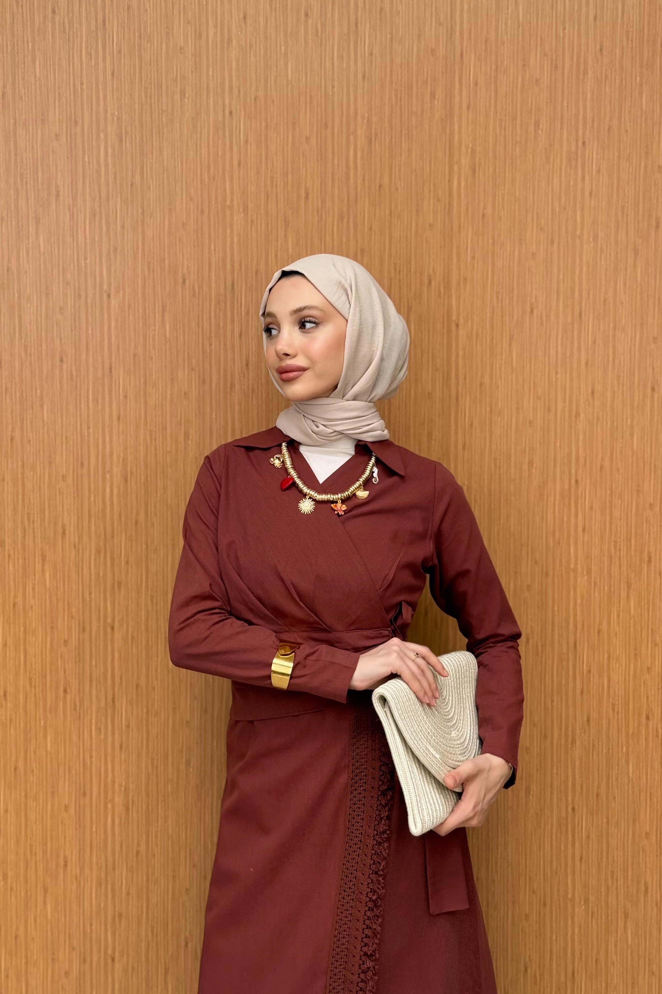 Tesettür V Yaka Bağlamalı Keten Elbise - Kiremit