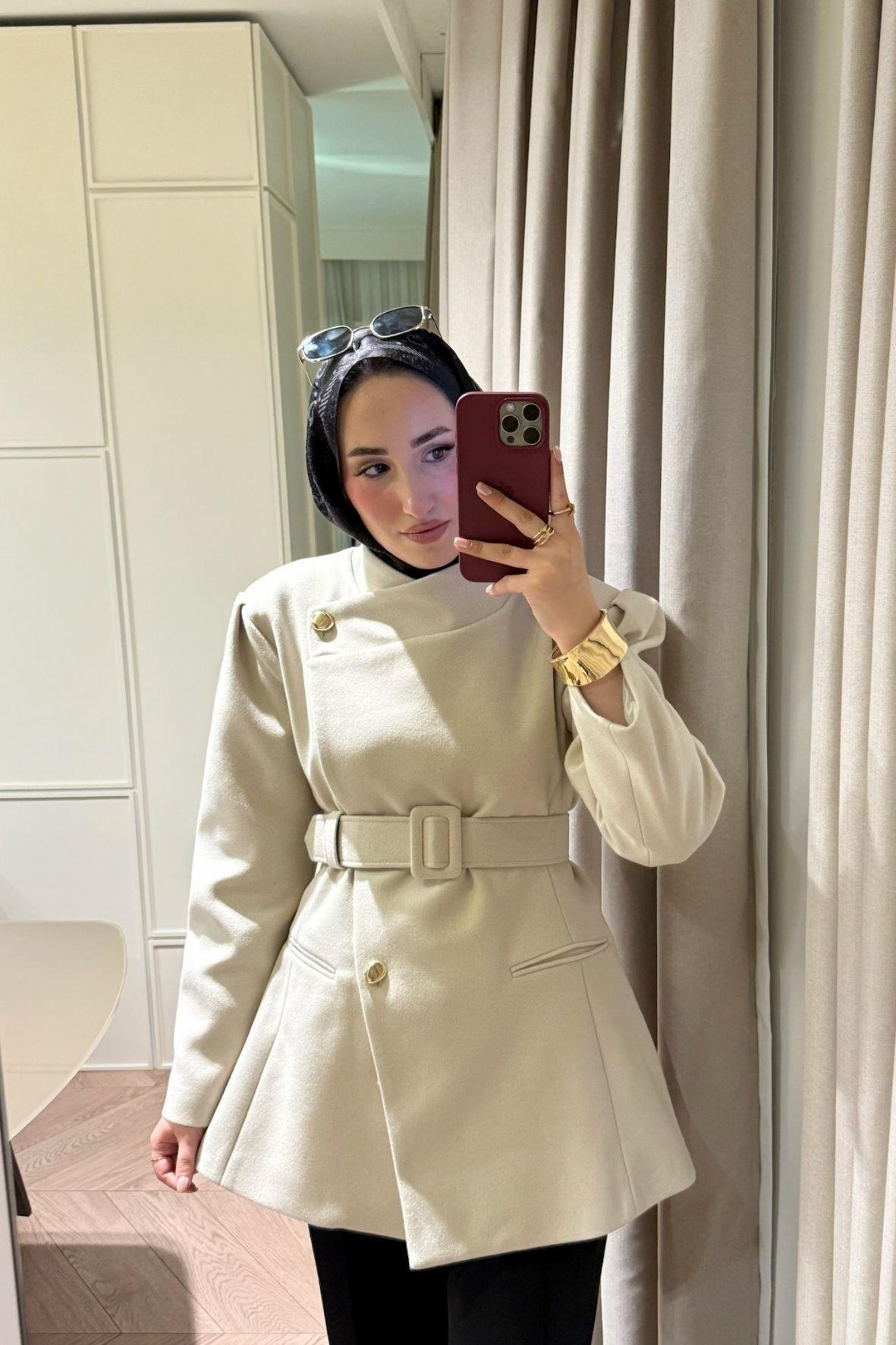 Geniş Yakalı Kaşe Kaban-Ekru-H400